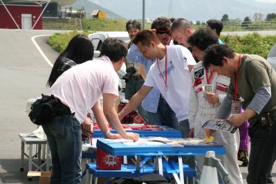準備できたら、 受付開始です 参加者のみなさ〜ん、前方へ集まってって 自身のネームをとってね |