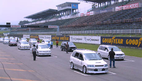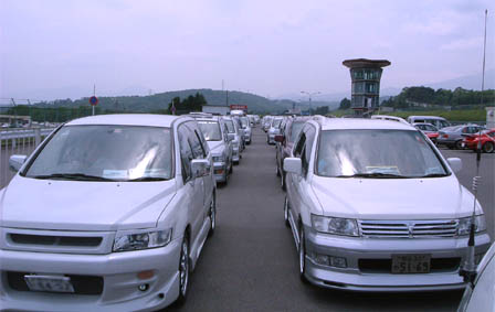 スターティンググリッドの順番は受付時にくじをひいてもらいその時をまった。正午にサーキット走行希望者約35台はサーキットに向け出発、途中サーキット走行担当者による整列を行いコントロールタワー裏にてその時をまった。FISCO担当者の合図で順番にスターティンググリッドに整列を開始。