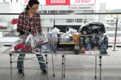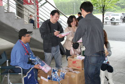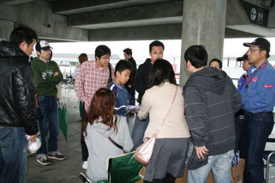 午前7時 本大会のテーマは『団欒』、その言葉の意味の通り 参加車両は円を描く駐車としました。 ごんたさんとこんかずさんが中心となり、半径20m、 円周は120m超の巨大な円が出来上がりました。 そこには約30台のグランディスが並びます。 同時にスタンド側の空きスペースを利用して、交流の 場が作られています。 TADさん、きゃささん夫妻、ごんたさん夫人らを中心に BBQコンロやテーブル、協賛品が並べられ参加者の 到着を待ちます。 |