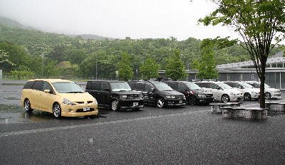 午前8時 関東や中部、関西方面から続々と参加車両が到着します。 綺麗なグランディスのサークルが段々と出来あがってきます。 所定の位置に誘導駐車後、受付です。 |