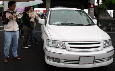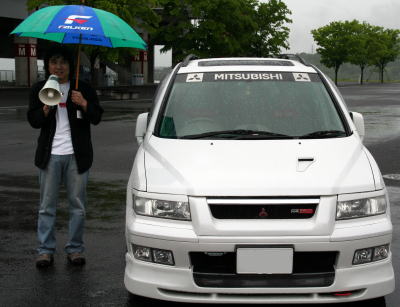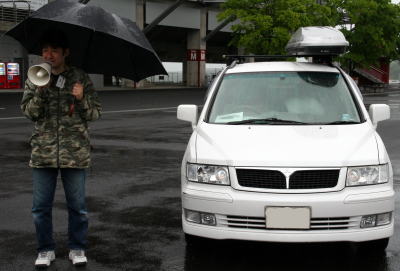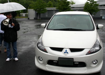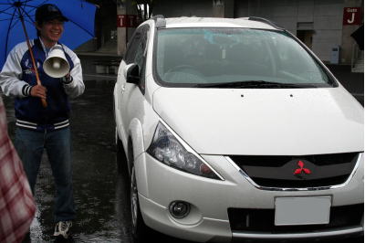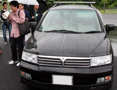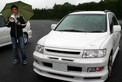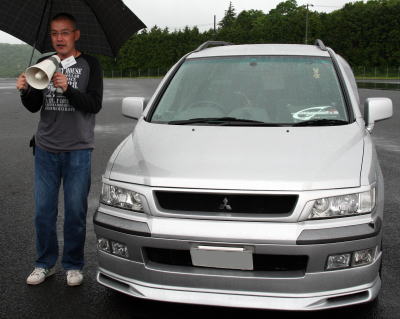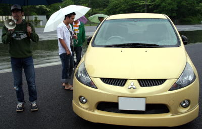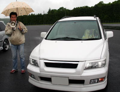 | お次は関西のしげぞーさんです。 個性的なグランディスは見るものを圧倒します。 今年は奥さんの他、赤ちゃんを連れての参加です。 |